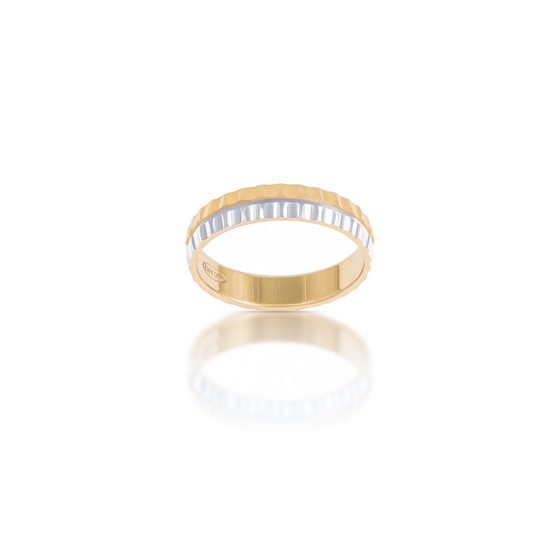 This two-tone ring combines warm yellow gold with a bright white gold center. Fine ribbing on the white gold adds subtle sparkle, while scalloped yellow gold edges provide texture and comfort. The smooth inside makes it perfect for everyday wear.