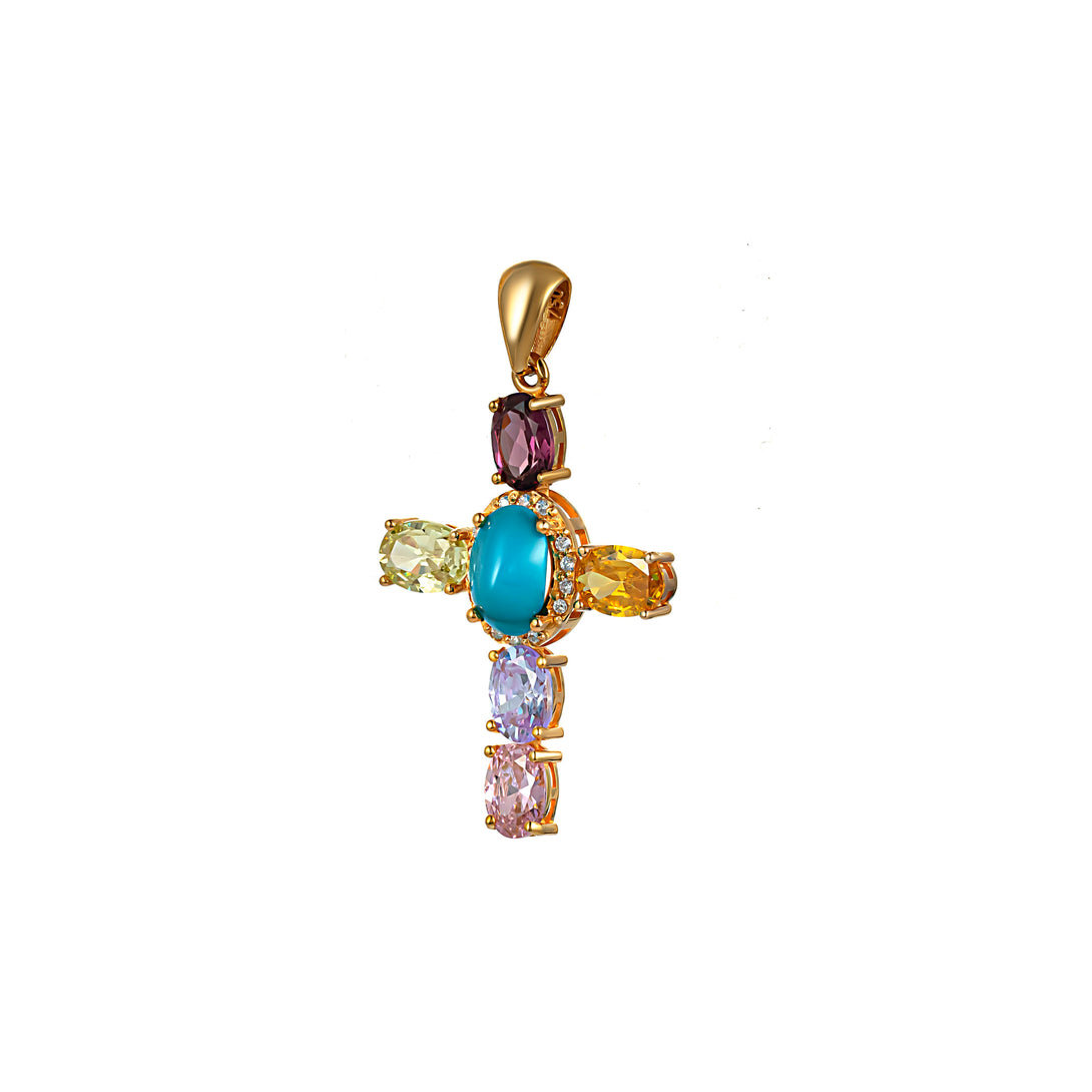 A vibrant and artistic cross pendant crafted in 18KT yellow gold, featuring a stunning combination of colorful gemstones. The centerpiece is a captivating oval turquoise stone, surrounded by emerald-cut gems in shades of purple, yellow, and pink, symbolizing harmony and individuality. A perfect statement piece that blends modern design with timeless elegance.